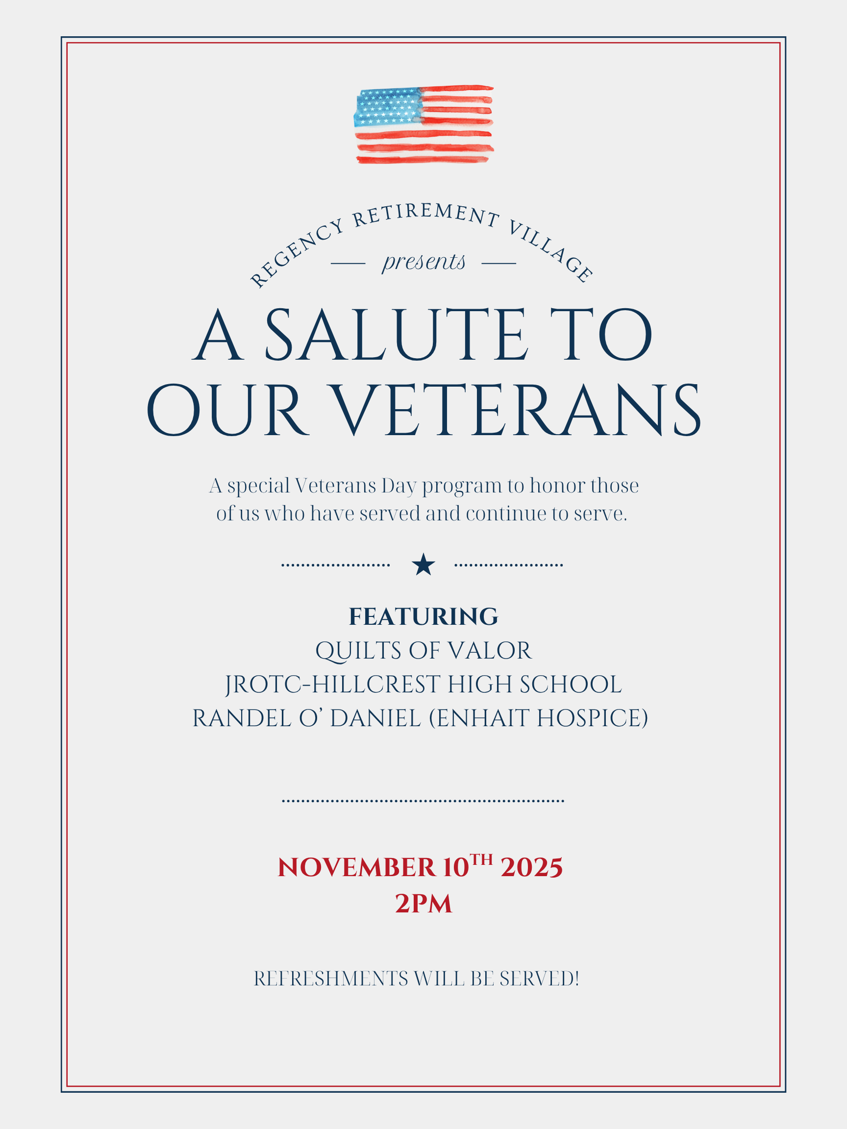 Join us as we come together to honor the brave men and women who have served our country. This special Veterans Day program will feature heartfelt tributes, patriotic performances, and a touching presentation by our community and guests.